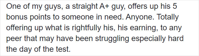 Siswa sekolah menengah atas itu, yang merupakan siswa A + langsung alias terkenal pandai, meminta gurunya untuk memberikan 5 poin nilai bonusnya kepada siswa di kelasnya yang mendapat nilai terendah pada ujian.