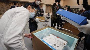 Pekerja di Tokyo Medical Center termasuk di antara yang pertama dari sekitar 40.000 profesional medis yang ditargetkan untuk menerima pengiriman awal vaksin.