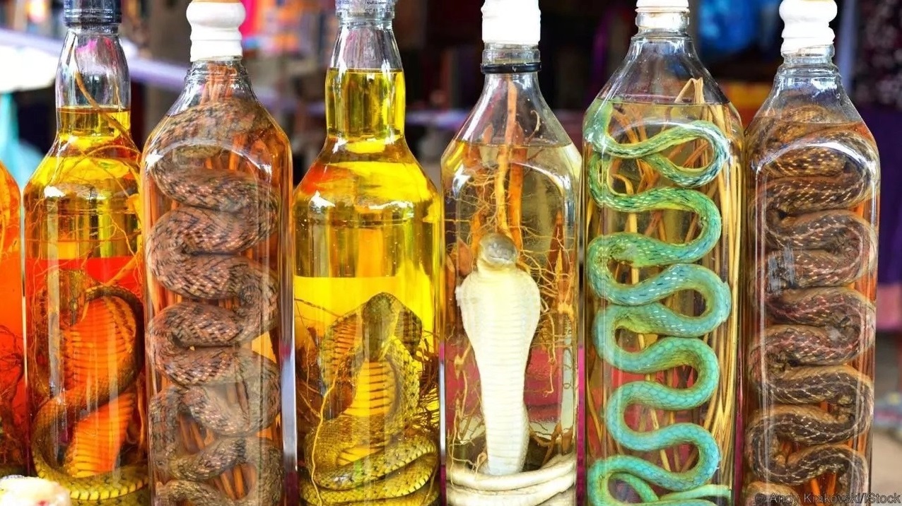 Di wilayah Asia, terdapat sebuah toko minuman keras yang cukup unik. Pasalnya, mereka menggunakan ular di dalamnya. Jadi, ular diletakkan pada toples yang berisi minuman anggur beras. Rasa yang ditimbulkan akibat perpaduan ular dan minuman itu pun terbilang unik. Menurut kepercayaan yang beredar, dengan minum wine tersebut bisa membuat rambut rontok sembuh, vitalitas meningkat hingga mata rabun jadi sembuh.